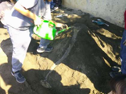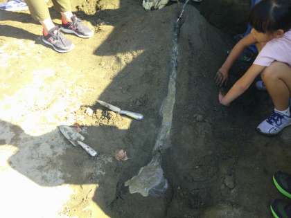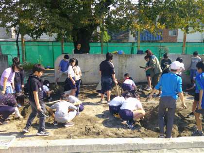 5年生は理科で「流れる水の働き」について学習しています。今日は、校庭の砂場に山や川のモデルを作り、水を流した時に土地がどのようになるのかを実験して、その様子を観察しました。流れる水の働きには3つの要素がありますが、問題を解決し、自分たちで気付いていけるように学習を進めていきます。