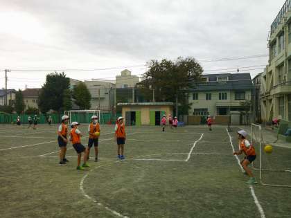 5年生は今、ハンドボールに取り組んでいます。この時期は球技をやる学年が多いです。寒空ですが、子どもたちは元気いっぱい。とても楽しそうです。元気な声が校庭に響いています。