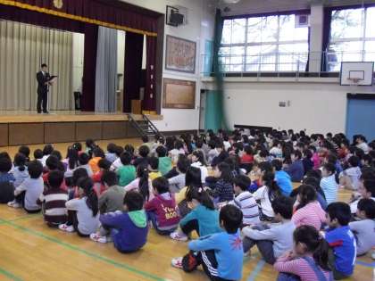 学校では、毎週月曜日に全校朝会を行います。全校朝会では、校長先生の話と今週の生活目標の話があります。4月23日の全校朝会の校長先生のお話は、新学期を迎えて届いた文部科学大臣からのメッセージの紹介でした。メッセージ紹介の後、「震災で大変な思いをしているまだ多くの人々にできることの一歩として、お世話になった人や見守っていただいている人に『ありがとう』を伝えましょう。身近な人への『ありがとう』の優しい気持ちが、被災地の人々にも優しさの輪として届くことでしょう。」そんなお話を校長先生からしていただきました。子どもたちは、とてもいい姿勢でお話を聞くことができ、立派でした。