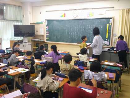 1年生の国語の学習です。カタカナの言葉「フ」や「ワ」の頭文字の言葉をたくさん集めた後は漢字の練習。入学して7か月くらいですが、覚えた漢字もたくさんになってきました。