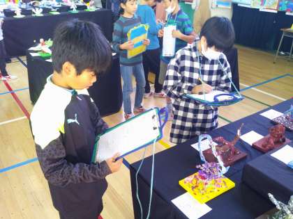5時間目は5年生の鑑賞時間。みんな1000を超える作品を真剣に鑑賞していました。とどろきフェスタ全校の取組として、「いいね!カード」に取り組んでいます。作品の良いところを見付け、ペアの学年の子に書いたり、クラスの子に書いたり、お気に入りの作品を作った子に書いたりしています。あっという間に1枚目を書き終わり、もっと書きたい!と2枚目をもらう子がたくさんいて感心しました。鑑賞態度も大変すばらしく、さすが5年生!と思いました。