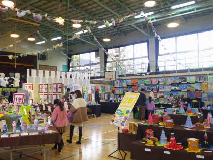 放課後は保護者・地域の方々に参観いただいています。一度下校した後、おうちの人と一緒に参観に来た子もたくさんいます。一度参観できている子どもたちは、おうちの人に作品紹介をしていました。放課後は6年生のフェスタ実行委員の子どもたちが作ったスタンプラリーもでき、クリアするとおもちゃをもらえます。そちらを楽しんでいる子もいました。