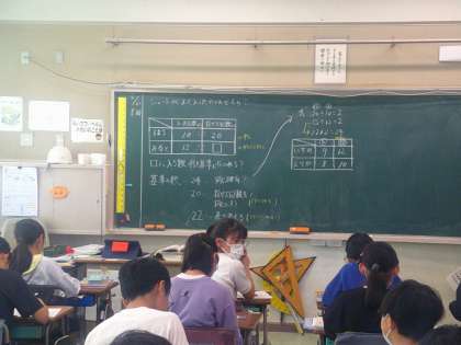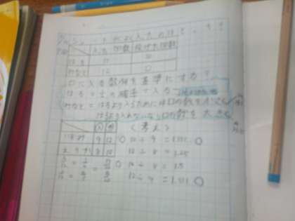 投げた回数と入った回数が違う場合。どちらがよく入ったのだろう?各コースこのような問いで学習していました。問いの考え方は1つではありません。分数にして分母をそろえたり、1回あたりに入った数を調べたり、みんなで割合の学習につながる考え方を話し合いました。