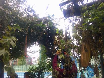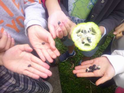 すずしくなると生き物はどのようになるのだろうか?という学習問題を解決するために、花壇に来て観察していました。春から育ててきたヘチマやヒョウタンは、実をつけ、枯れてきた実の中には種がたくさん入っていることに気が付きました。来年この種を植えてまた育てられるとよいですね。