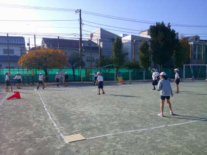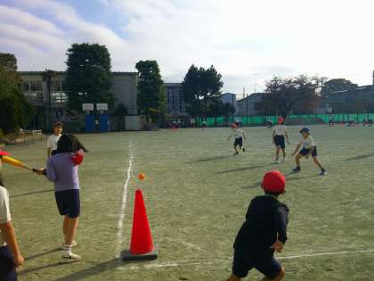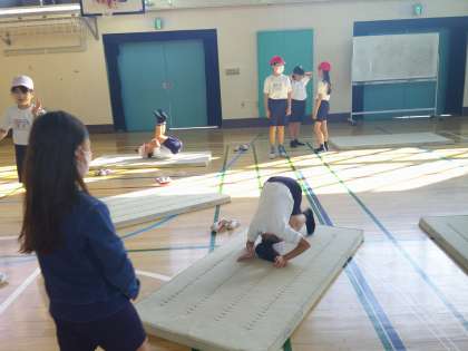 今日の体育は、「Tボール」と「マット運動」。それぞれのクラスがみんなで教え合って、楽しく活動しています。