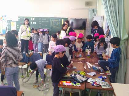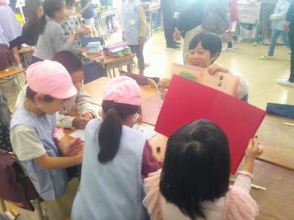 教室は遊んでもらえるように、しっかりと準備をしてあります。どんぐり拾いをしたときの材料も使って、射的や落ち葉釣り(魚釣り)などのゲームやおもちゃで遊びました。一つ下のお友達に丁寧に優しく説明する姿を見て、1年生も素晴らしい成長をしていると感じました。年長の皆さんも最後の感想で「1年生になったらこんなこともできるんだと思った。」と入学を楽しみにしてくれていることや「みんなと遊べて楽しかった。この思い出は忘れたくない。」と楽しかった様子を話してくれる子もいました。最後に1年生からお土産をたくさんもらってにっこり。短い時間の交流会でしたが、とてもすてきな会となりました。