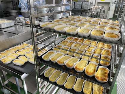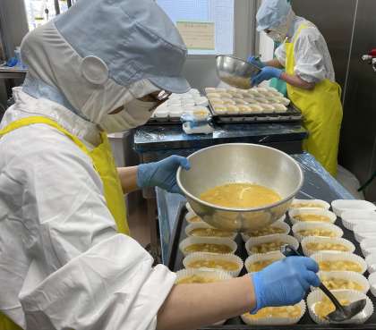 スペイン風オムレツは、じゃがいもやお肉が入ったオムレツのことです。じゃがいもやお肉を炒めて、溶き卵と混ぜ合わせて、カップに分けてから、オーブンで焼きました。使った卵は、なんと560個!!一日1個食べても食べきれない量の卵を、リズミカルに割って、ほぐしました。
