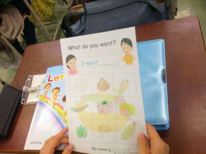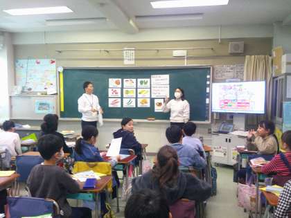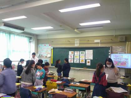 4年生の外国語の学習です。担任やALTの先生、友達と楽しく会話しながら、英語に親しんでいます。