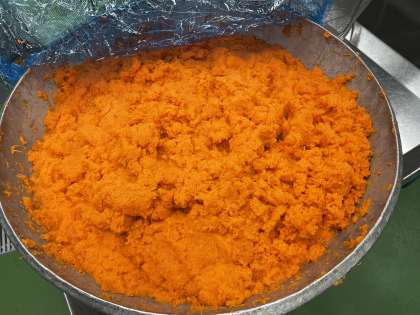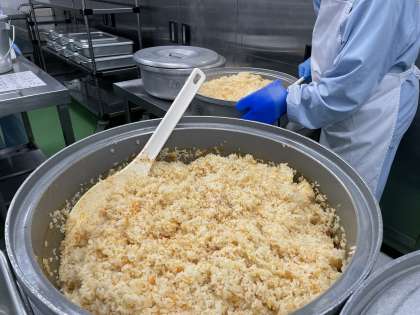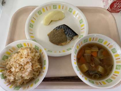 あけぼのごはんは、旬のにんじんをすりおろして、お米、塩、しょうゆを一緒に炊き込んで作りました。「あけぼの」のように、きれいなオレンジ色のごはんが出来上がりました。にんじんは一年中お店に並んでいますが、にんじんの旬は冬で、今からがとっても美味しくなります。すりおろして炊き込んだので、苦手な人も食べやすくできあがりました。おかわりの列ができているクラスもありました。