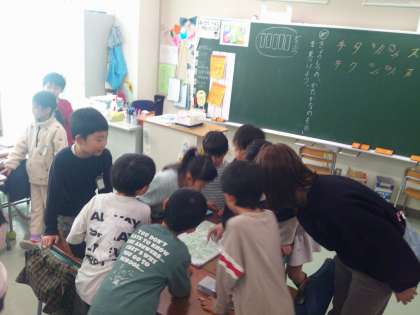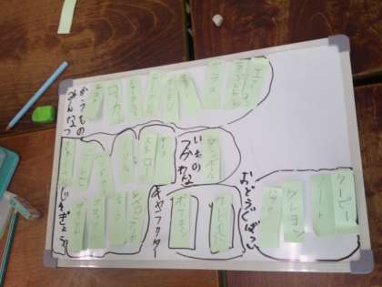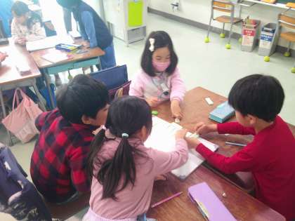 今日は「カタカナをかこう」という学習をしました。まずは、アとマ、シとツなど間違えやすいカタカナを確認して、さあ!カタカナ探し。教室の中にあるカタカナで書くものを探し、グループごとに集めました。ノート、ガラス、チョーク、ランドセルなどなど、身の回りにはカタカナで書くものがたくさん。カタカナ言葉の仲間分けもでき、友達と教え合いながら、習ったカタカナで実際に書く練習をたくさんできました。