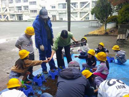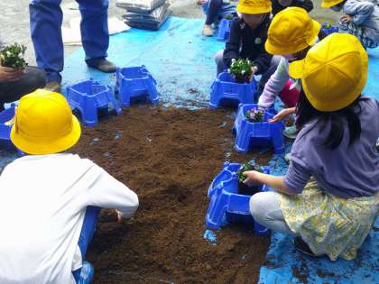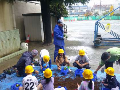 アサガオを育て終わった植木鉢に、花の植え替えをしました。昨日の2年生に引き続き、鈴木園芸さんにゲストティーチャーとしてご来校いただき、ビオラの苗とチューリップの球根を植えました。来年春の入学式の頃に新一年生をきれいなお花でお迎えできるとよいですね。