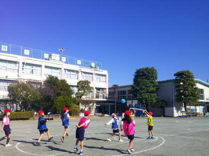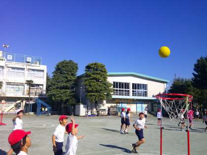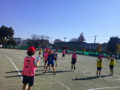 4年生はバスケットボール型のゲームをしています。4年生くらい大きくなると、バス回しや声のかけ方も迫力が出てきます。作戦も考えながらゲームを楽しんでいました。
