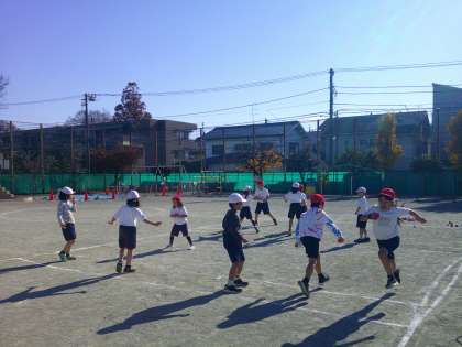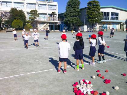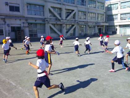1年生は「しっぽとり」と「宝運び鬼」。しっぽとりでは、腰についたタグをとられないようにしつつ友達のタグを取りにいきます。宝運び鬼では、相手にタッチされないようによけながらお宝のお手玉をゴールまで運び、何個運べたかを競います。どちらもみんな楽しそうに取り組んでいました。
