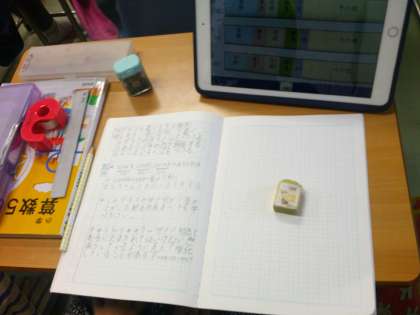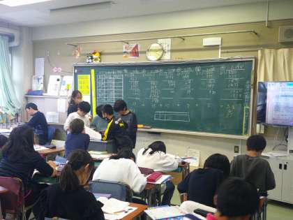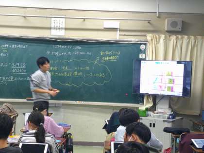 今取り組んでいるのは割合の学習です。割合にだまされてはいけない。減っているように見えて、実は増えているときがある。(調査の合計数が違う場合など)割合は全体の傾向を見るときには便利だね。と気付いていきました。みんなしっかりと数学的な思考をはたらかせて考えることができました。