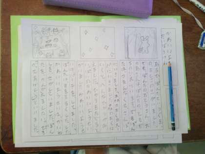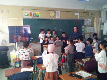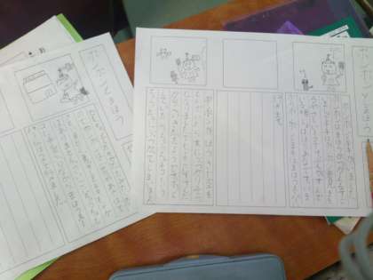 2年生も今週で音楽の授業は終わり。2学期最後の授業で、講師の先生と「おもちゃのチャチャチャ」を手振りもつけながら歌うことができました。とっても楽しそうでした。隣のクラスでは、国語の学習。2学期に学習したことを活かしてオリジナルの物語を書いていました。挿絵もあり面白い作品ができました。みんな気分は作家さんです。