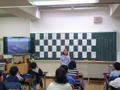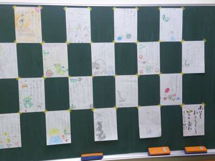 始業式後の3年生の授業です。まずは、年末に書いたクラスの友達宛ての年賀状の紹介をしました。辰年にちなんだすてきな年賀状です。黒板に貼った年賀状の前で、それぞれの児童が冬休みの思い出についてスピーチしました。みんな分かりやすく、楽しく紹介することができました。