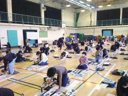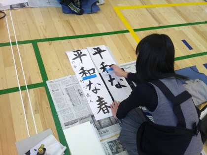 今日は6年生。体育館に学年全員で集まって「平和な春」と書きました。みんな願いを込めて真剣に取り組みました。他の学年もこれから書いていきます。学校公開中に展示しますのでご覧ください。