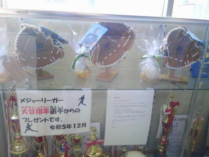先日お伝えした、メジャーリーガーの大谷翔平選手のプレゼント。展示をしましたので、ご来校の際にご覧ください。