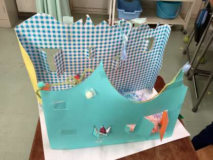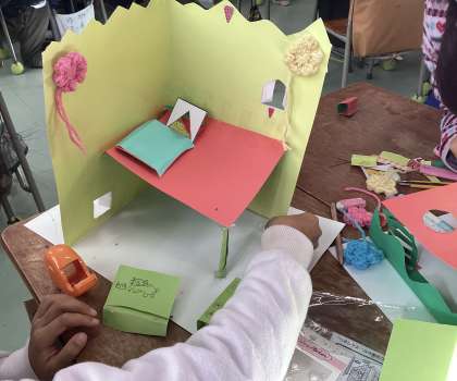 学校公開では、保護者の皆様にお手伝い頂き、安全にカッターを使って画用紙に窓を開けました。今日は、飾り付けをしました。お城にしたり、テラスハウスにしたりと素敵な作品となりました。