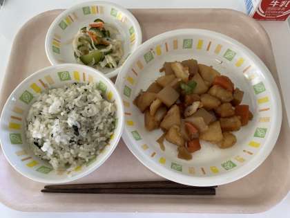 毎月19日は「食育の日」ということで、等々力小学校では「かむかむ献立」の給食にしています。かむかむ献立とは、かみごたえのある食材や料理を組み合わせた献立です。今日は歯ごたえのあるイカに下味をつけて片栗粉をまぶし油で揚げたものと、じゃがいもを素揚げしたものと、野菜を甘辛い味で煮からめて揚げ煮を作りました。酢の物は、切り干し大根を水で戻して、にんじん、きゅうりと一緒にサッと茹でて、甘酢だれで味付けをしました。柔らかく煮て食べることが多い切り干し大根ですが、水で戻してサッと茹でるとパリパリ、カリカリとした食感がして、煮物とは違った美味しさを味わえます。