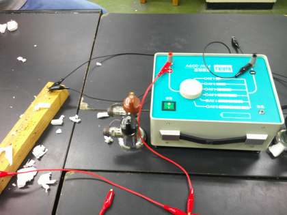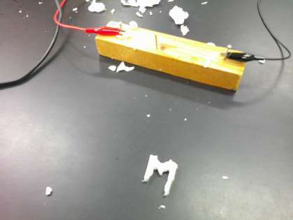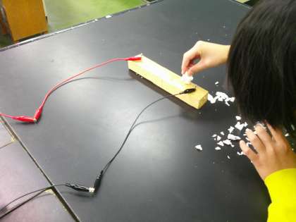 電気の利用について学習している6年生。電気のエネルギーは、光、音、熱、磁力などに変えることができることが分かり、今日は電熱線を使って電気を熱に変えて実験しました。発泡スチロールを溶かすことができ、その変化を確かめることができました。