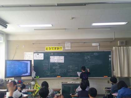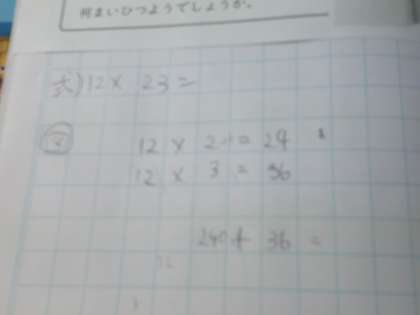 今日は、立式すると「12×23」昨日のかける数が何十ではなく、一の位も0ではない演算です。20と3に分けて考えたり、12を10と2、23を20と3に分けて考えたりしました。でも後者のダブルサクランボの方法だとうまくいきません。みんなで話し合いながら計算方法を考えていくことができました。