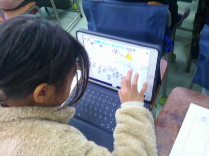 みんなで遊べる遊びを調べ、紹介する学習です。調べたことをタブレットで情報共有して、紹介したい遊びを決めています。その遊びについて、はじめ、中、終わりのまとまりに気を付けながら説明文を書いていきます。別のクラスは「つなぎ言葉」の学習です。「はじめに」「それから」「ところが」などの言葉をたくさん見付けて、黒板いっぱいに整理しました。2年生ですがこれだけの言葉を使っていて、子どもたちの力ってすごいと感じました。アナログもデジタルも両方を効果的に使い学習を進めています。