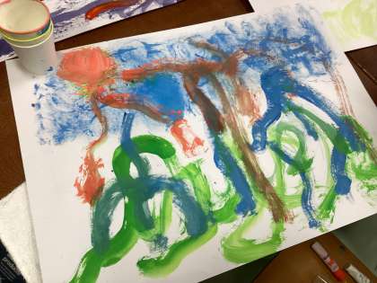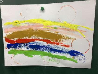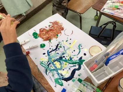 絵の具を画用紙に直接落として、厚紙や段ボールの切れ端などでのばす作品「えのぐひっぱレインボー」の学習です。ヘラでのばす感覚を味わいました。乾かして、後日クレパスやサインペンで絵を描きます。