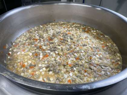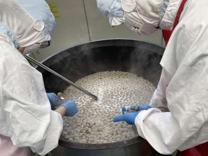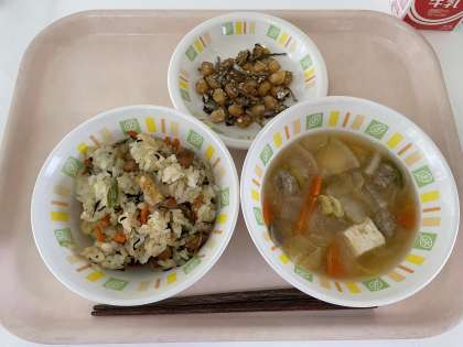 明日は2月3日節分ということで、今日は節分メニューでした。大豆を使った、大豆とじゃこの甘辛揚げ、いわしのすり身を使ったつみれ汁にしました。地域によっては、柊の枝にいわしをつけて玄関に飾ることで、鬼や厄払いをするという風習があります。そのいわしを使ってつみれにしました。食べやすいようにたらのすり身も混ぜて作りました。つみれが苦手な子もいましたが、おかわりじゃんけんをしている子もいました。磯おこわは、昆布やひじきが入った具と、もち米入りのごはんを混ぜ合わせて作りました。