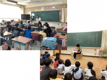 絵本の国の読み聞かせを聞きました。今日の絵本は、「おまたせクッキー」「どっちからよんでも」の2冊です。「おまたせクッキー」は、クッキーを食べようと思っていたところにどんどん人が訪問してきて、「また食べられないじゃん!」とツッコミを入れながら聞いていました。「どっちからよんでも」は、「よるいけば おばけいるよ」「みみたぶ まゆ まぶた みみ」など、たくさんの回文を紹介する絵本でした。回文に興味津々で、楽しそうに復唱しながら聞いていました。読み聞かせしていただいた保護者の皆さま、ありがとうございました。