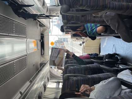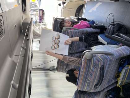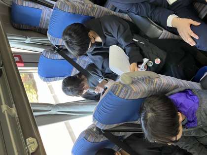 プロのバスガイドさんが同行しない社会科見学。子どもガイドをしてくれています。世田谷区の名所、有名人、お菓子、ファッション、せたがや育ちの野菜などについての説明やクイズで楽しんでいます。これから、通過する大田区のこと、森永製菓のことなどについてガイドが続いていきます。みんな上手です。