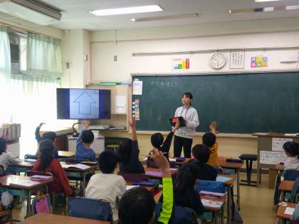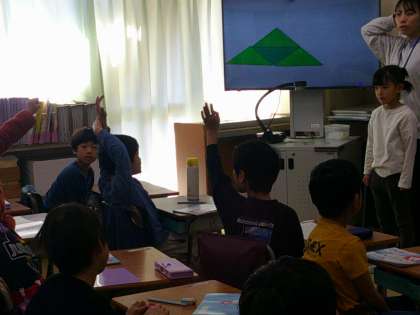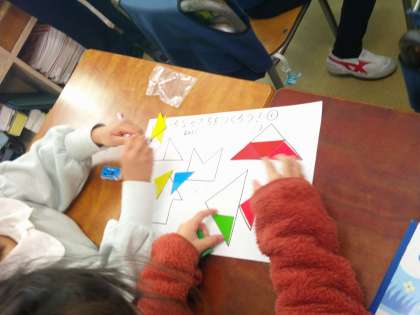 形作りの学習をしている1年生。今日は三角形を組み合わせて、おうち、お魚、飛行機などいろいろな形を作りました。みんな夢中になって取り組み、学習の最後には「三角形の長いところ長いところを合わせると四角形ができる」など、形の特徴をとらえて、振り返りができる子もいて素晴らしいと思いました。これからどんどん形を作って、図形感覚を高めていきます。
