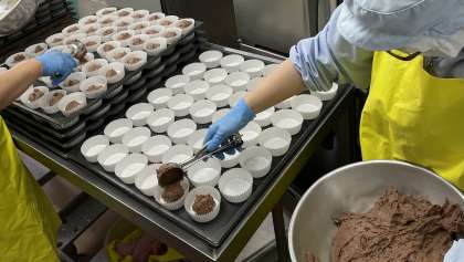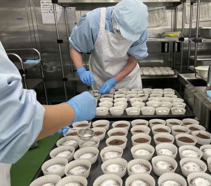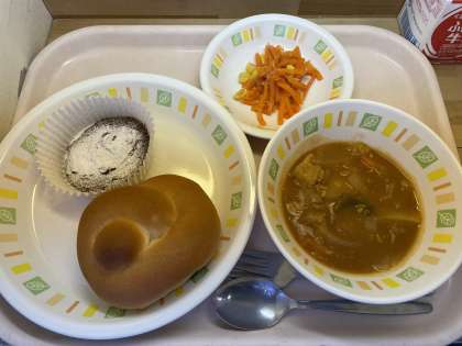 今日はバレンタインデーということで「豆腐と米粉のブラウニー」を作りました。木綿豆腐をミキサーにかけて、油、砂糖、米粉、コーンスターチ、ベーキングパウダーを混ぜ合わせて、オーブンで焼きました。サラダは、今が旬でおいしい人参をたっぷり使ったにんじんサラダです。らっきょう入りのドレッシングやツナと和えて作っています。意外と人気のサラダです。