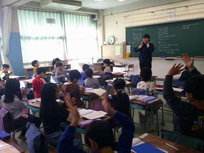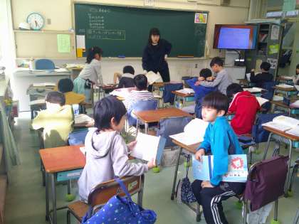 今日は「どこにあるかな」という位置を説明する学習です。マス上に並んでいるものの位置を説明します。いろいろな説明ができるけれど、上から2番目だけだと1つに決まらない。右から2番目という2つの説明が必要だね。と考えることができました。授業の最後には教室の座席を使って「起立着席ゲーム」を楽しみました。もっとやりたかったという声も聞かれ、楽しく算数の学習をすることができました。