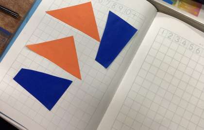 算数では、半分に分ける学習をしています。「丸いケーキを2人でわけることはできますか。」の問いに「むずかしいなあ。四角形ならできるかな。」と意見がでたので、折り紙をケーキに見立てて2人で分ける活動をしました。活動を通して、直線で切る必要性について学ぶことができました。