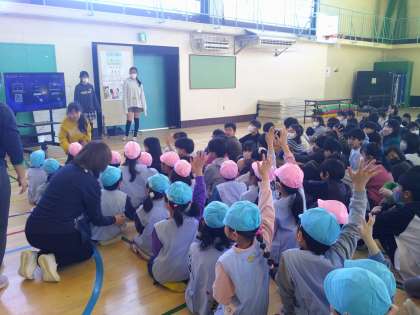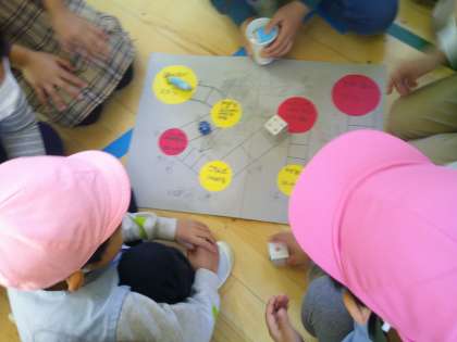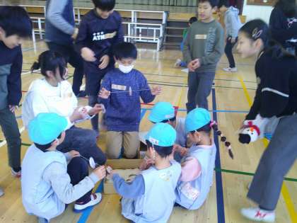 遊びの後半はそれぞれ場所に園児が行って遊びます。お手玉、竹とんぼ、双六、けん玉、ブンブンゴマ、福笑い、あやとり、かるた、とたくさんの遊びを準備してくれました。園児たちは夢中になって遊んでいました。かるたや双六、お手玉の玉など遊び道具は全て手作りです。最後には「幼稚園に帰ってからも遊んでね。」と園児にプレゼントしてくれました。優しく接してくれて、園児たちは大喜びでで、「楽しかった!」という感想がたくさん聞けました。本当にすてきな5年生。4月からまた兄弟学年として一緒に活動するのも楽しみですね。5年生のみなさんありがとうございました。
