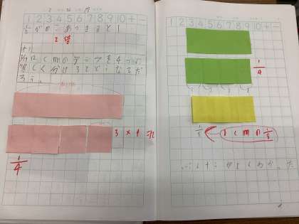 2年生は分数の学習をしています。12センチメートルのテープを2回半分に折るとどうなるでしょう?という問題に挑戦しました。