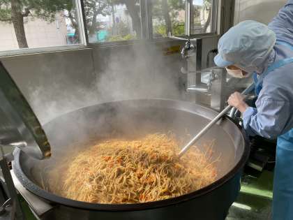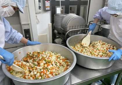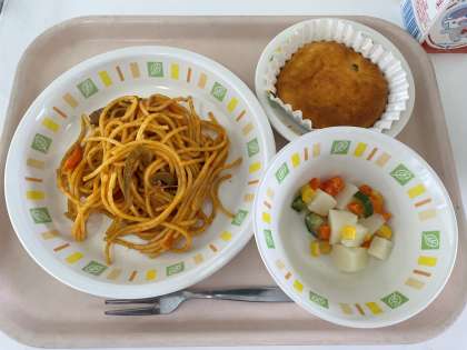 マセドアンサラダは、フランスの家庭料理で野菜を角切りにしてドレッシングとあえて作ります。じゃがいも、人参、きゅうりを、すりおろしの玉ねぎ入りドレッシングで和えました。りんごのヨーグルトケーキは、りんごの缶詰とヨーグルト入りのケーキです。