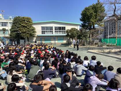 校庭にいる子どもたちは校庭の真ん中に集まってしゃがみ、教室にいる子どもたちは机の下に入り、身を守る体勢をとった後、校庭に避難しました。担任の先生以外と避難する子どもたちもいましたが、混乱なく避難できました。