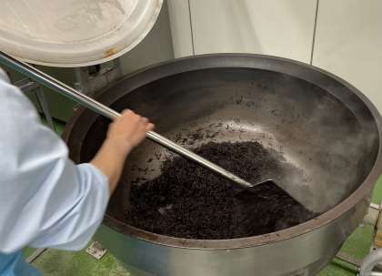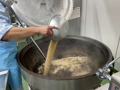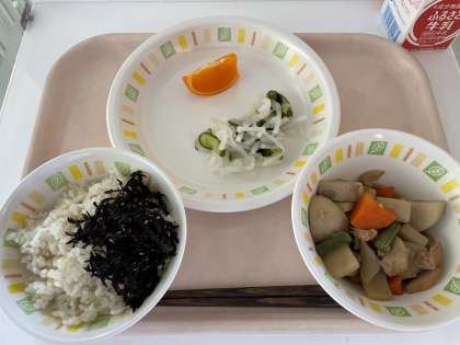 ごはんは七分つき米を使いました。玄米よりも食べやすいごはんです。ひじきのふりかけとも相性ばっちりです。ひじきは海藻で、古くから日本で食べられてきた食べ物で、鉄分や食物繊維が多く