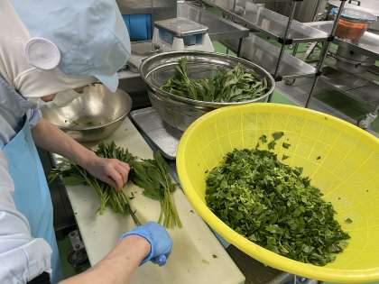 今日は「旬を食べよう給食」の日でした。春に収穫される春キャベツを使ったスパゲッティや、あしたばを使ったサラダを作りました。春キャベツは、冬キャベツと比べてやわらかく、サラダや炒めものにすると美味しいです。明日葉は、春ごろになると柔らかい新芽が出て美味しくなる時期です。今日は三宅島でとれた明日葉が届きました。明日葉は、「今日摘んでも明日には葉が出ているほど生命力がある」ことから明日葉と呼ばれるようになったそうです。旬の食べ物から力をもらって元気に過ごしてほしいと思います。