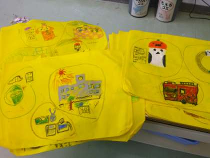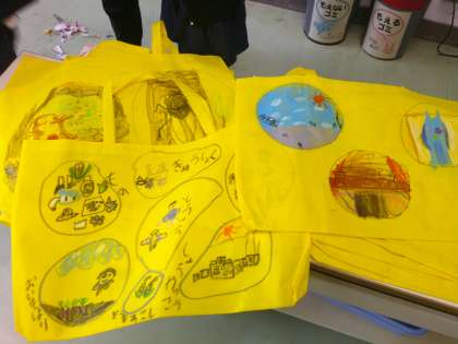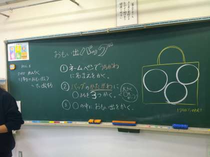 今日は、「思い出バッグ」を作りました。入学してからもうすぐ1年間が終わろうとしています。運動会やお芋ほり、給食、ビオトープなど、学校行事や学校生活で様々な体験をした1年生。振り返って思い出に残っていることを描きました。世界に一つだけのバッグです。このバックに、今年一年で描いたり作ったりした作品を入れて持ち帰ります。1年生の保護者の皆様楽しみにしていてくださいね。