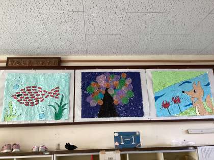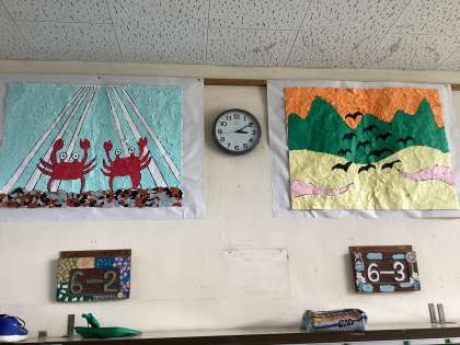2年生は、6年生にお世話になった思いを込めて、国語の教科書で学んだ物語の場面を「ちぎり絵」で表現しました。さて、問題です。1年生から6年生の1枚ずつ製作しましたがどの場面でしょう。