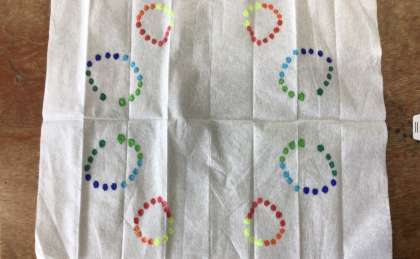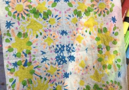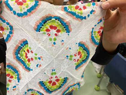 ティッシュを何回か折り、カラーペンで点々を打つと すてきな模様が誕生しました。色の組み合わせや配置を考え開くまでのお楽しみです。「メガネみたいになったよ。」「その模様、どうやったらできるの?教えてください。」と鑑賞会も行いました。身近な道具でできますのでお家でも楽しんでみてください。