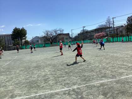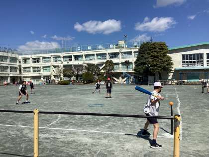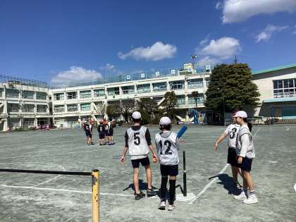 5年生の体育の学習でTボール(野球と同じようなルールでピッチャーがいない代わりに固定されたボールを打ちます)を行なっていました。お天気も良く体育日和です。
