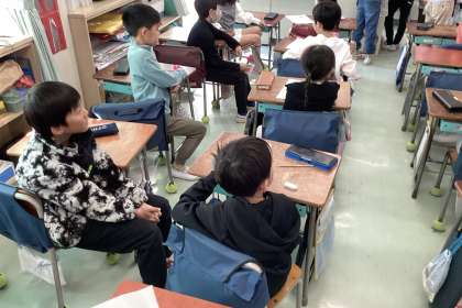 国語で学んだ一年間の思い出について、1年生が2年生へ遠足の時のペアで発表しました。お礼に2年生は、お店やさんに招待しました。一年間の交流で名前を顔をばっちり覚えていて、名前で呼び合いながら楽しい時間を過ごしました。異学年交流はすてきですね。