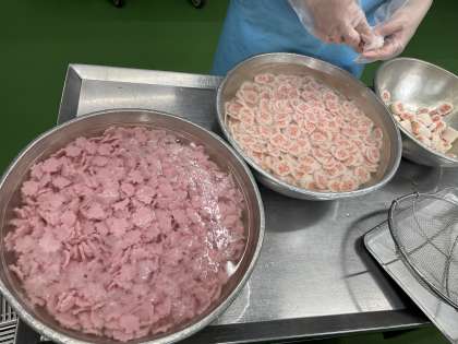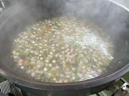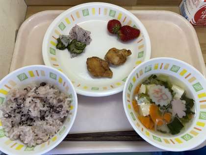 今日は、令和5年度最後の給食でした。4月から進級・進学ということで、お祝い給食にしました。子どもたちに人気の唐揚げや、いちご、すまし汁には「祝」と桜のかまぼこを入れて、お祝いの時に食べる「お赤飯」を炊きました。2年生の教室では、「一年間ごちそうさまでした!」「おいしかったよ!」と元気なメッセージをもらって、とても嬉しかったです。来年度も給食室で力を合わせて、安全で美味しい給食を作っていきたいと思います。