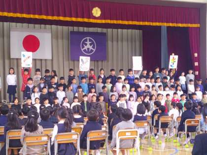 入学式のあとは、2年生によるアトラクション。等々力小学校の生活について、学年みんなで元気いっぱいに紹介してくれました。勉強する内容や1年生から6年生まで一緒に遊ぶキッズ班の活動、おすすめの給食などなど、等々力小学校の魅力を伝えてくれました。1年間の成長を感じる素晴らしい発表でした。