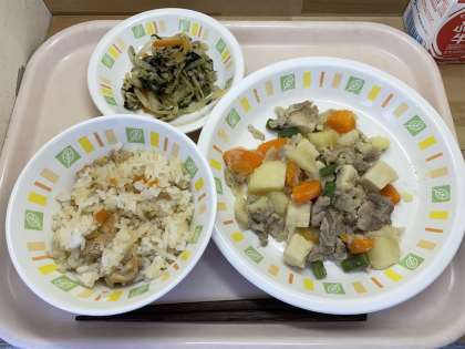 こぎつねごはんは、小さく切った油揚げをたっぷり使って作った具をごはんと混ぜて作りました。味が染みた油揚げがとても美味しく出来上がりました。塩肉じゃがは、醤油を使わずに塩と砂糖やみりんを使って味付けしました。のり酢和えは、野菜と刻みのりとタレを混ぜ合わせて作りました。