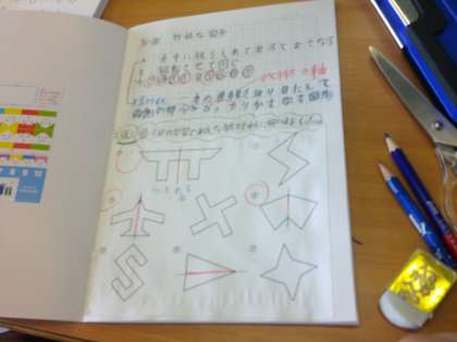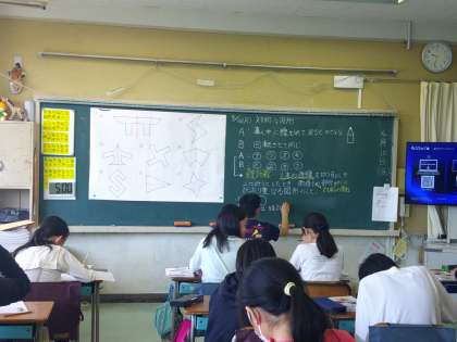 算数少人数でコースごとに分かれての学習が始まっています。今年は元3年4組を空き教室になったので、1つのコースの子どもたちはそちらで学習しています。今日の課題は様々な図形の特徴をとらえて分類することです。対象な図形について理解を深めていきます。みんなとても集中して取り組んでいて立派でした。